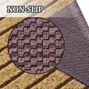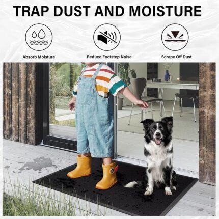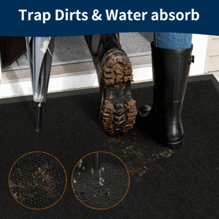 This heavy-duty front door mat features a deeply grooved, woven polyester surface that effectively traps dirt, mud, and moisture, keeping
